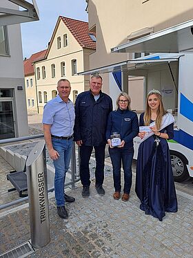 Anlässlich der Jubiläums-Challenge zum 30-jährigen Bestehen der MIDEWA besuchten Doreen Ecke und Thomas Kahl am 9. April 2026 Bürgermeister Christian Runkel in Bad Lauchstädt.