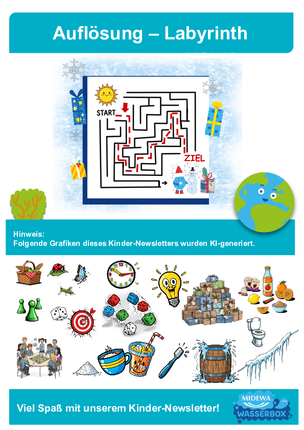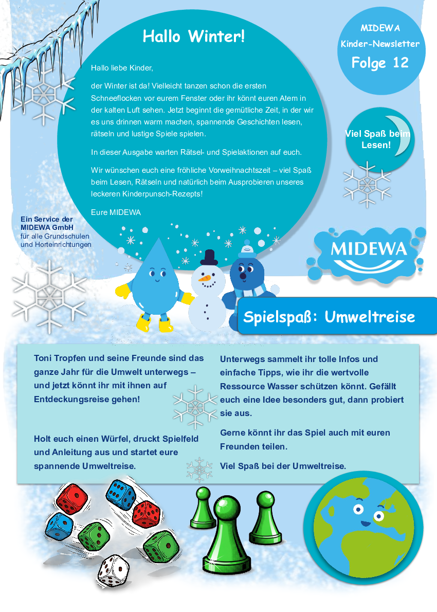 Kinder-Newsletter. Mehrmals im Jahr gibt es Anregungen zur Gestaltung von eigenen Wasserprojekten, Ideen für abwechslungsreiche Spielpausen, Rätsel, Rezepte, Basteltipps und vieles mehr. Ein Service für alle Grundschulen und Kinder im Alter zwischen 6 und 12 Jahren. Unter infonoSpam@