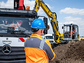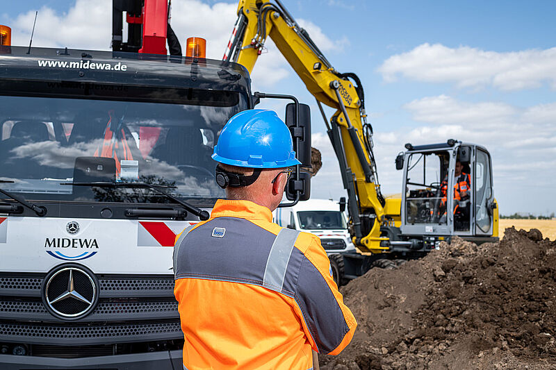 Christian Winkler: "Das defekte Schieberkreuz ist bei Wartungsarbeiten festgestellt und sofort Ersatz bestellt worden. Jetzt wird es gewechselt. Zu diesem Zweck müssen wir die Wasserversorgung unterbrechen, versuchen aber, die Arbeiten so schnell wie möglich zu erledigen." Wie der Leiter des MIDEWA-Versorgungsbereiches ausführt, seien fast alle verfügbaren Mitarbeiter seines Versorgungsbereiches an diesem Tag auf der Baustelle im Einsatz. Das Schieberkreuz ist eine wichtige Schnittstelle im Versorgungssystem und muss jederzeit funktionstüchtig sein. "Darüber können wir die Versorgung der angeschlossenen Haushalte über die Zubringerleitung entweder abstellen, was wir zum Beispiel bei Wartungsarbeiten machen, oder auch umleiten", erläutert er.
